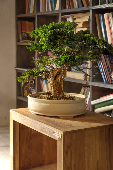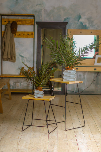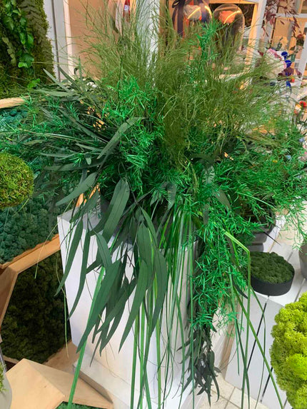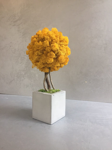 Materials & Care: preserved trunks/foliage, mineral-stabilized media, weighted planters; keep dry; avoid sun/spray/wind.