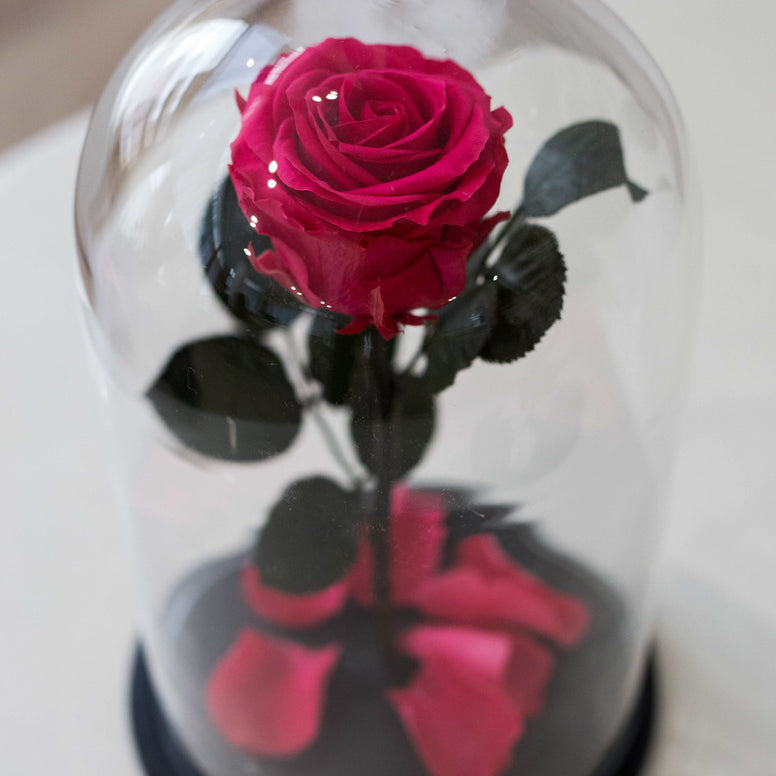 One premium preserved rose (stabilized). Carefully placed under a transparent glass dome, like a treasure.