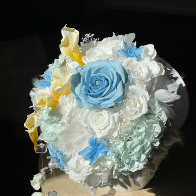 Ethereal and timeless, captures the pure essence of love suspended in a single moment. Handcrafted from preserved flowers, this bridal bouquet is designed to outlast the day it was made for - a delicate keepsake that holds your memories in bloom.