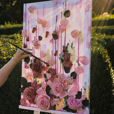 This handcrafted piece is made from preserved roses, petals and golden accents, blending volume and texture to create a truly tactile, emotional artwork.