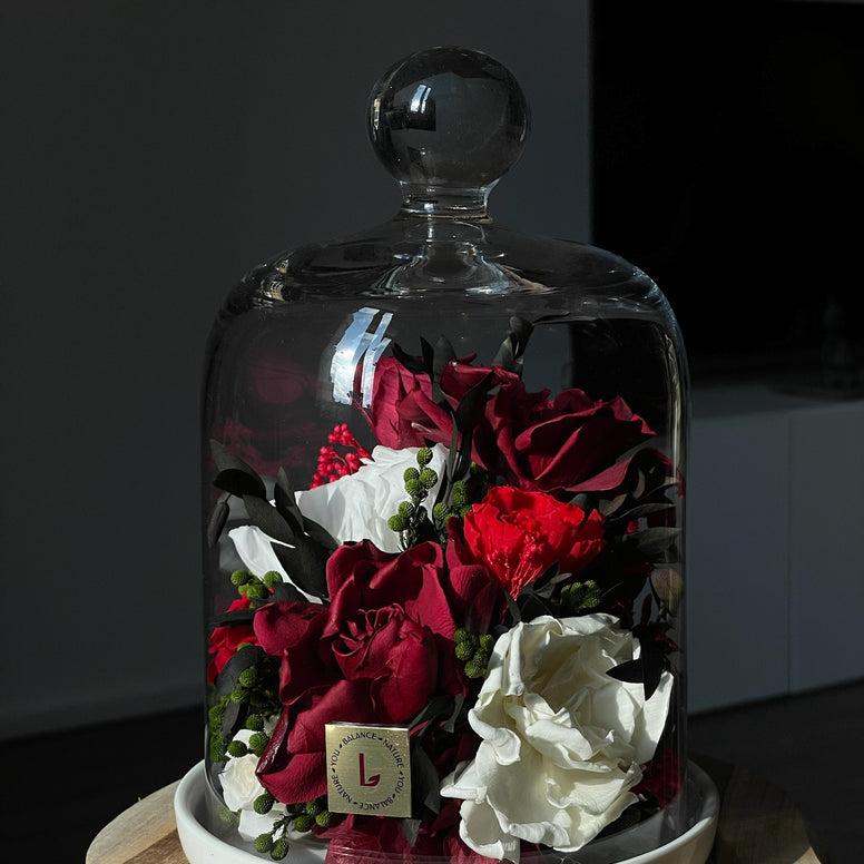 A lush blend of premium preserved (stabilized) roses, carnations, and symbolic foliage in deep red, ivory, and burgundy. Sealed under a transparent glass dome - a sensual bouquet that asks for nothing, yet says everything.